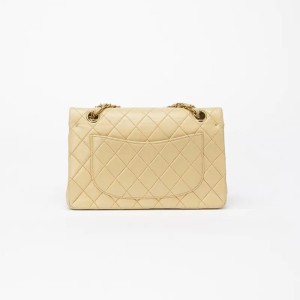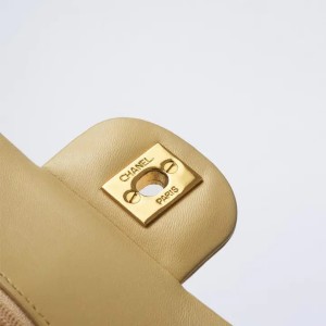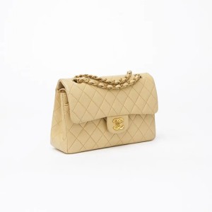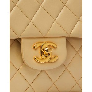 - A Classic Double Flap Medium made from Lambskin in Beige. It features shiny golden hardware, CC lock and leather-interwoven chain.