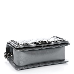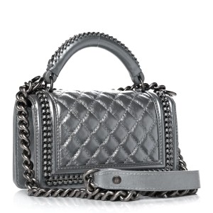 - This chic crossbody bag is crafted of calfskin leather with a double diamond stitch and a peripheral framed quilting in dark silver. The bag features an aged ruthenium chain-link shoulder strap with a shoulder pad, a looping top handle with a leather-threaded chain detail, and matching trim along the edges. The bag opens with a ruthenium boy CC press-lock to a grey fabric interior with a flat pocket.