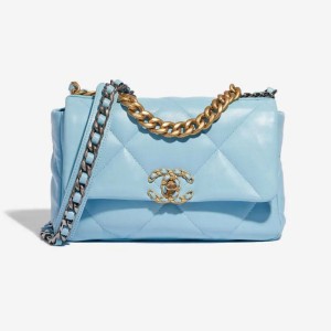 - Crafted with a padded, rectangular silhouette, this beautiful 19 Flap Bag has been made in France from lambskin in a light pastel blue shade. It is topped with the style’s chunky two-tone metal chain and interwoven CC logo.