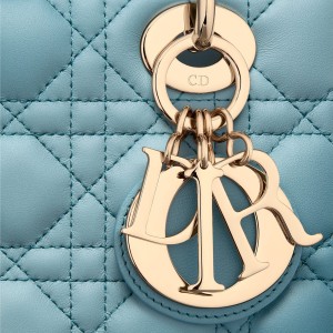 The Lady Dior bag embodies Dior’s vision of elegance and beauty. Refined and sleek, the creation is timeless. Crafted in azure blue lambskin with Cannage stitching, its supreme quilting instantly stands out. Silver-finish metal ‘D.I.O.R.’ charms offer a modern allure. Featuring a thin removable leather shoulder strap, the medium Lady Dior bag can be carried by hand or worn crossbody.