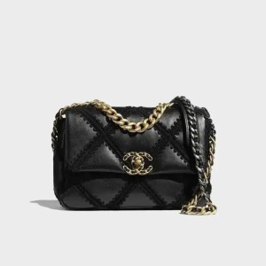 - This pillowy soft shoulder bag is crafted of oversized quilted tweed in black. The refined bag features a chain detail CC turn-lock on the flap, a magnetic snap pocket at the rear, and a leather threaded aged gold, ruthenium, and dark silver chain-link shoulder strap with a leather shoulder pad. The front flap opens to a red fabric interior with a zipper pocket.