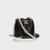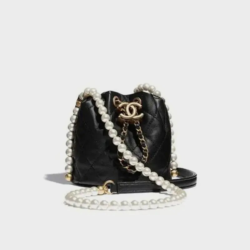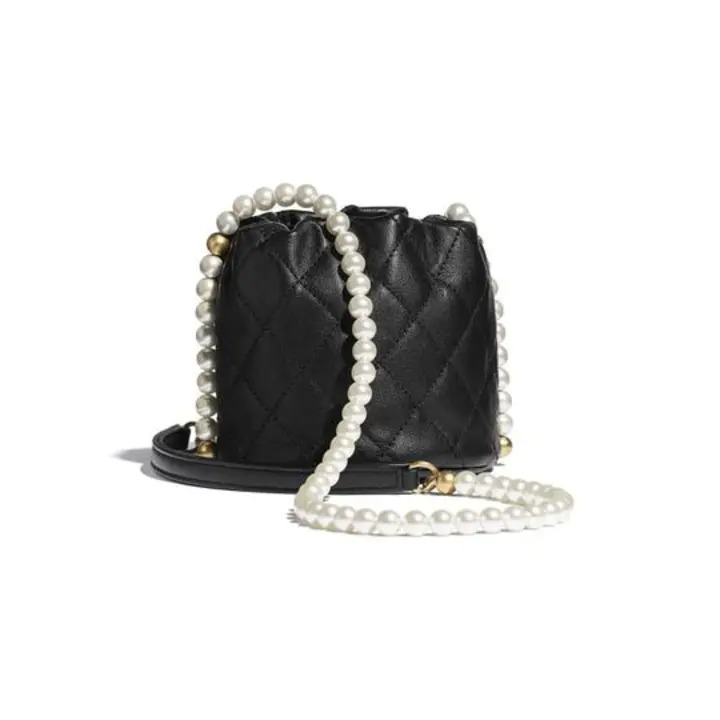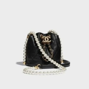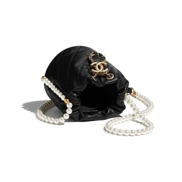 - This stylish handbag is crafted of diamond-quilted calfskin leather in black. The bag features a pearl shoulder strap and an aged gold CC drawstring. The top opens to a red fabric interior.