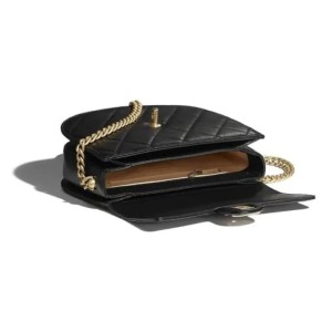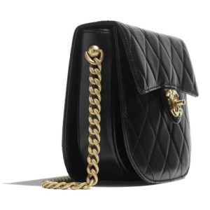 - This stylish clutch is crafted of smooth diamond quilted calfskin leather in black. The shoulder bag features a black leather threaded chain link cross body strap in silver, gold and ruthenium with a shoulder pad, as well as a matching CC logo leather zipper pull. This bag has two top zippers that open to a deep red fabric interior with card slots and a central open pocket.