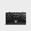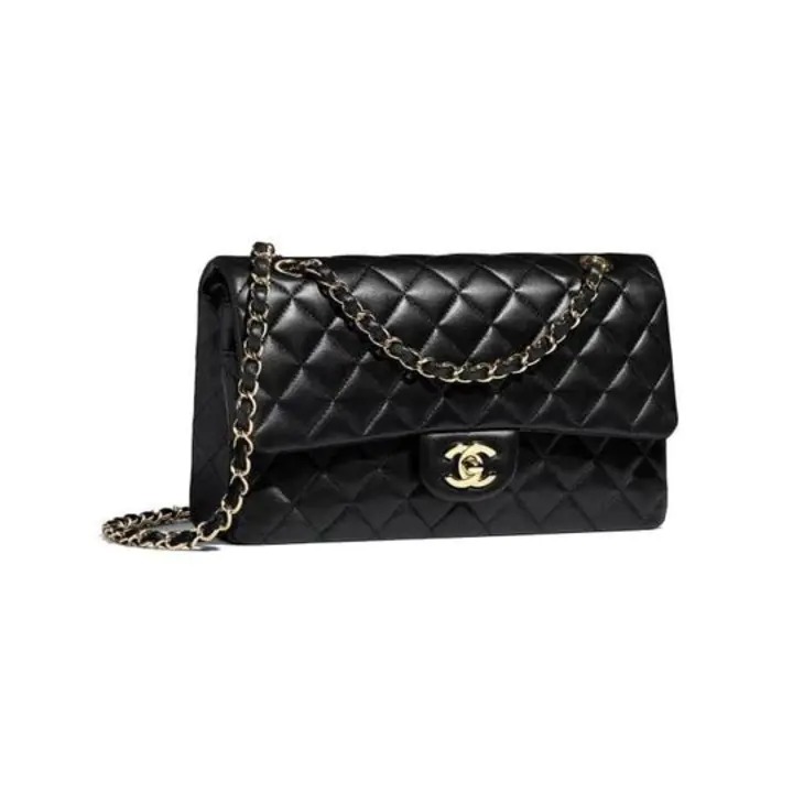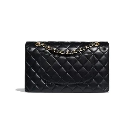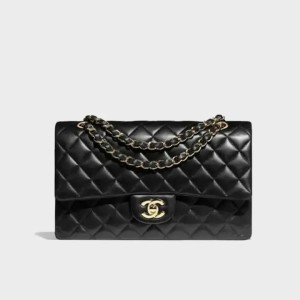 This shoulder bag is crafted of diamond quilted lambskin leather in black. The bag features a polished gold chain-link shoulder strap that is threaded with matching black leather. The front flap opens with a matching gold classic CC turn-lock to reveal an inner flap and a burgundy leather interior with pockets.