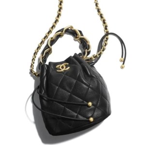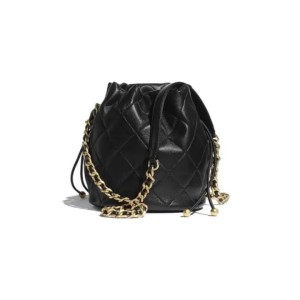 - This super chic bucket is crafted of glazed aged calfskin leather in black. The bag features a leather-threaded gold strap and a leather cinch-cord pull. The top opens to a red fabric interior with a patch pocket.