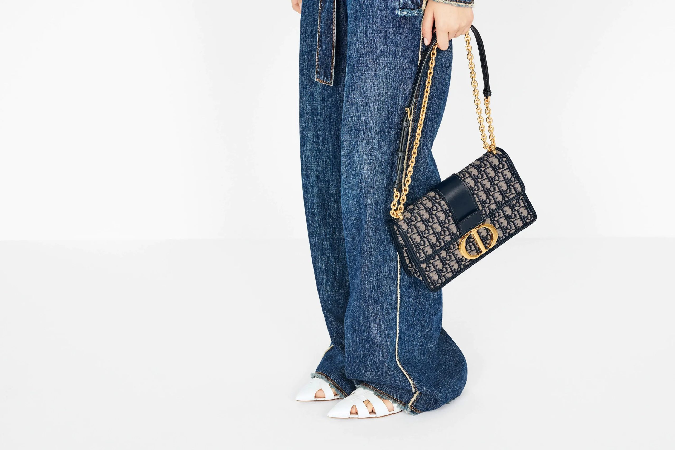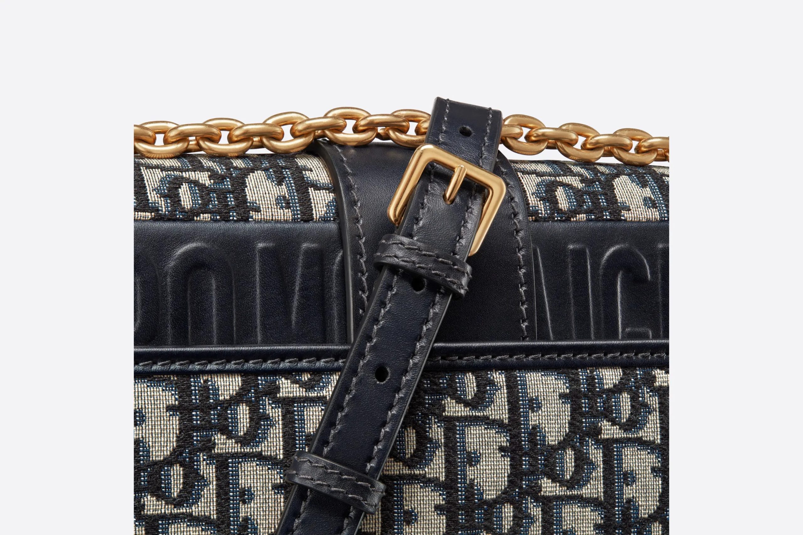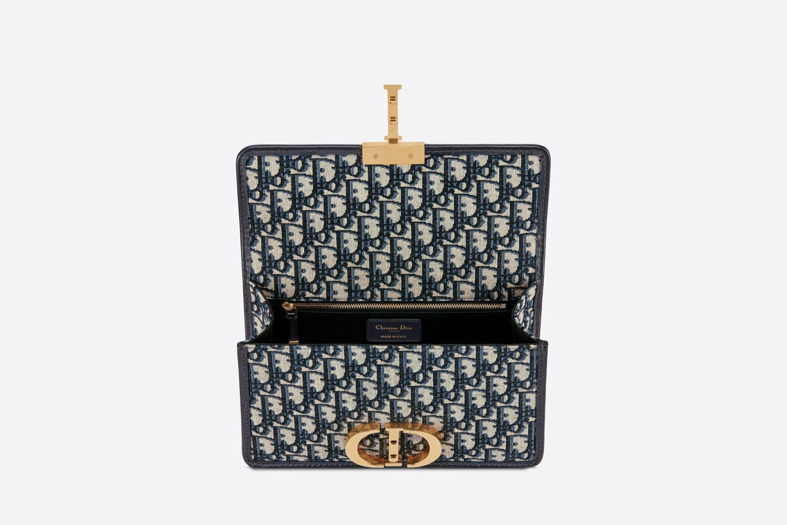 The 30 Montaigne line, inspired by the hallmark address, offers essential pieces that embody the House’s iconic codes. The handbag is crafted in blue jacquard and highlights the House’s iconic Oblique motif for an elegant and modern design. The flap has an antique gold-finish metal ‘CD’ clasp, inspired by the seal of a Christian perfume bottle. Other details, like the embossed ’30 MONTAIGNE’ signature at the back highlight the streamlined design. The bag features a chain that allows it to be carried by hand, worn over the shoulder or crossbody.