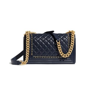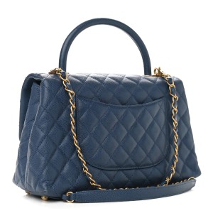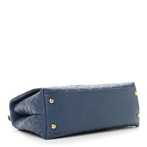 - This sleek classic tote is crafted of diamond stitched grained caviar calfskin leather in blue. The shoulder bag features a blue leather top handle, a leather threaded aged gold shoulder strap with a shoulder pad, and an aged gold CC turn lock closure. This opens the flap to a partitioned blue fabric interior with a zipper pocket, patch pocket, and central zipper compartment.
