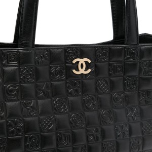 Introduced in the 1960s. the Choco Bar quilting is whimsical take on leather patterns. Crafted from black lambskin finished with the iconic technique. this tote bag from displays the signature interlocking CC logo to the front for a recognisable look.