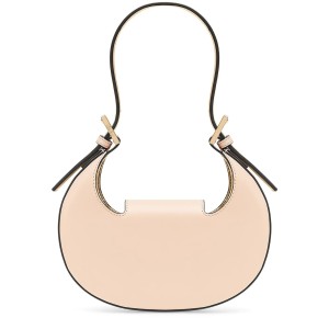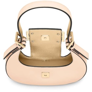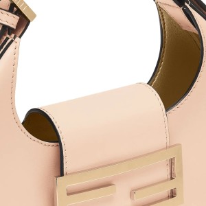 Made of pale pink leather, decorated with an FF clasp. Featuring an unlined internal compartment, gold-finish metalware. Can be carried by hand thanks to the adjustable shoulder strap.