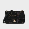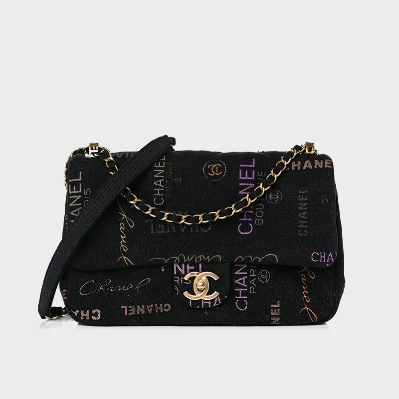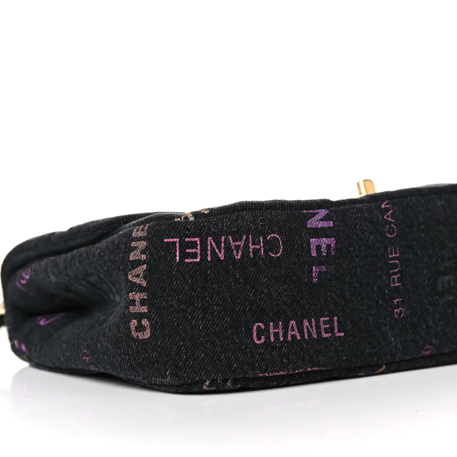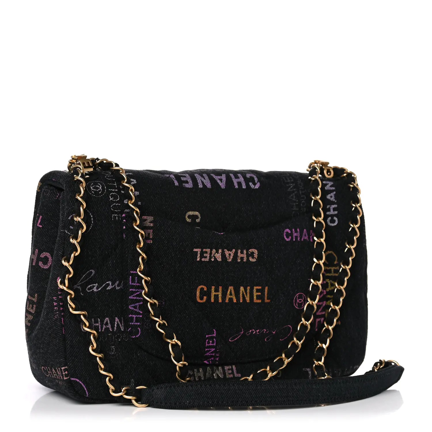This chic and unique flap bag is crafted in black denim. This bag features a diagonal threaded gold-tone chain shoulder strap. It also features a graffiti cc pattern and a gold CC turn-lock on the front opens the flap to a matching fabric interior with a zip pocket.