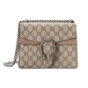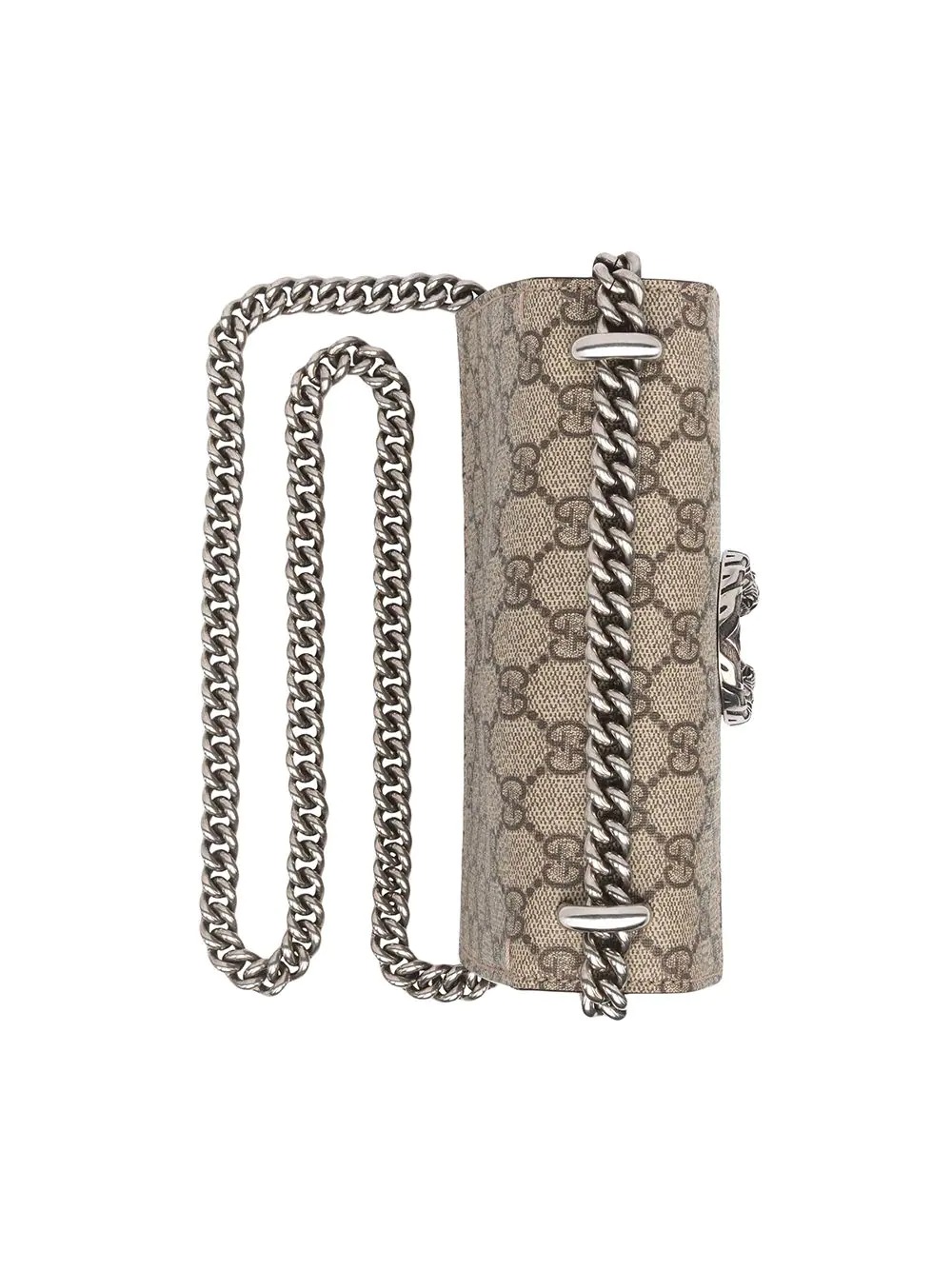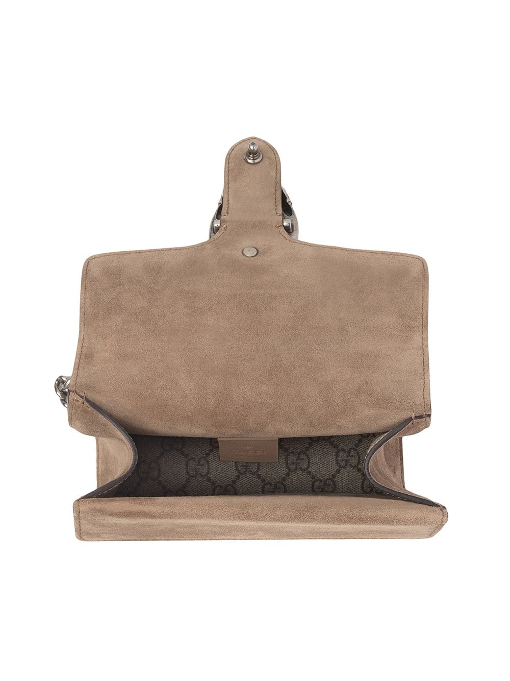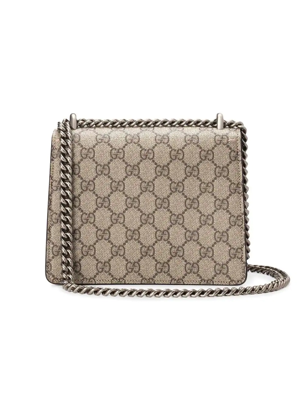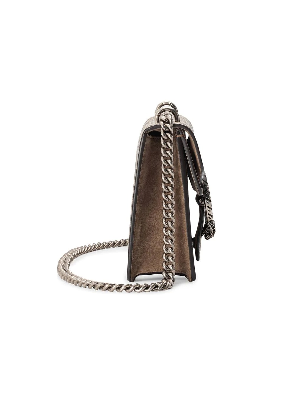 A mini structured bag with our textured tiger head spur closure. The sliding chain strap can be worn multiple ways. changing between a shoulder and a top handle bag. Beige/ebony GG Supreme canvas. a material with low environmental impact. with taupe suede trim. Antique silver toned hardware. Tiger head spur. Hand-painted edges. Hand-stitched details. Pocket under the flap. Sliding chain strap can be worn as a shoulder strap with 40cm drop or can be worn as a top handle with 23cm drop. Pin closure with side release. Mini size: W20cm x H15.5cm x D5cm.