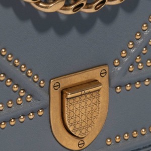 - With a dash of rock ‘n’ roll attitude. the studded CDama bag is a CD favourite. This medium-sized style arrives in excellent condition and has been crafted from smooth calfskin in grey. embellished with gold-toned studs and the signature chunky chain strap. The bag from 2017 only shows tiny scratches on the corners and on the leather. Pair it with an LBD and matching jewellery for effortless evening glamour.
