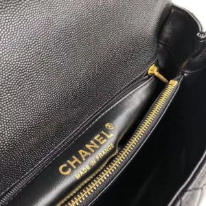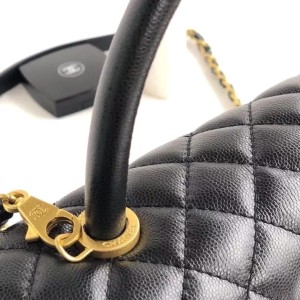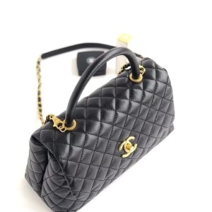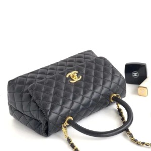 - This chic tote is crafted of diamond-stitched grained caviar calfskin leather in dark brown. The shoulder bag features a sturdy leather top handle, a removable gold chain-link leather threaded shoulder strap with a shoulder pad, a rear patch pocket, and a gold CC turn-lock on the front. This opens the flap to a partitioned dark brown leather interior with zipper and patch pockets.