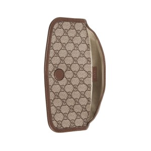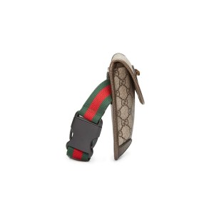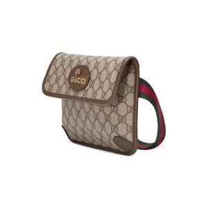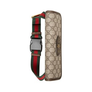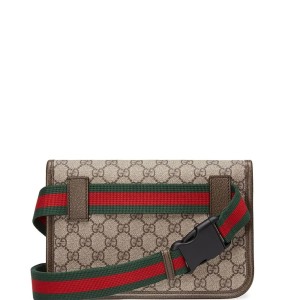The belt bag in GG Supreme has a retro-influenced design. Trimmed with leather. the style is meant to be worn around the waist. securing with a Web strap and buckle closure. Beige/ebony GG Supreme canvas. a material with low environmental impact. with brown leather trims. Green and red Web. Oval GG leather tag with a feline head. Adjustable nylon Web belt with plastic buckle closure. Magnetic closure. 9.5″W x 6.5″H x 1.5″D. Cotton linen lining. Made in Italy.