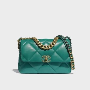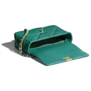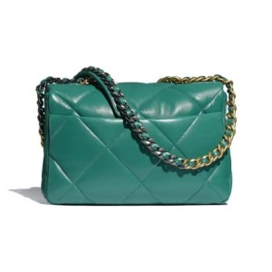 - This pillowy soft shoulder bag is crafted of oversized quilted calfskin leather in green. The refined bag features a green chain detail CC turn-lock on the flap, a magnetic snap pocket on the back, a chunky matte metallic blue and green chain top handle, and a leather threaded gradient green and gold chain-link shoulder strap. The front flap opens to a green fabric interior with a zipper pocket.