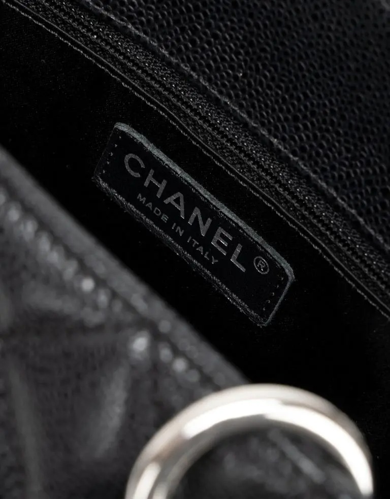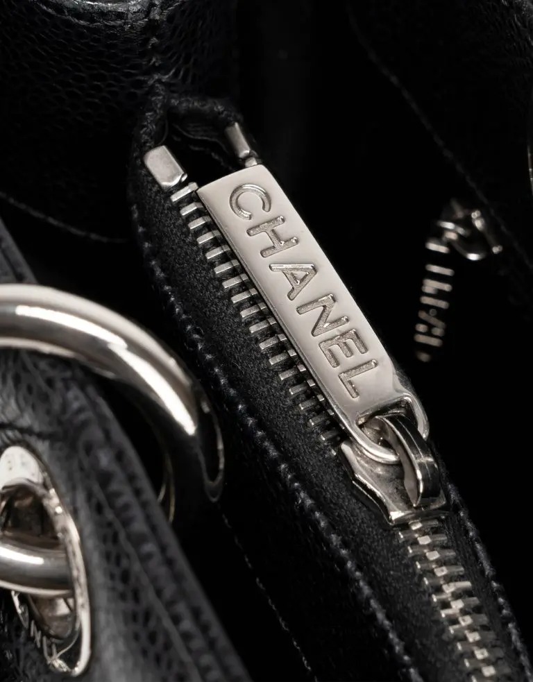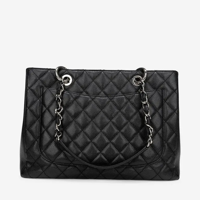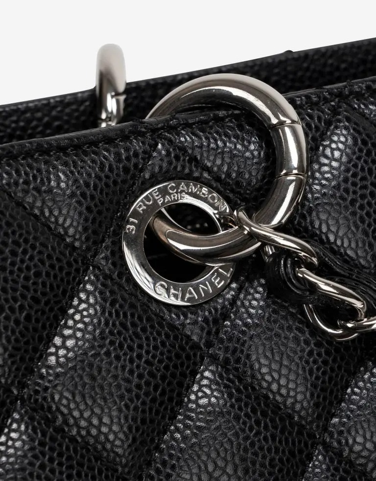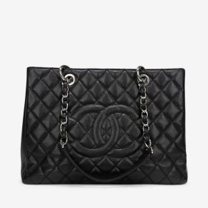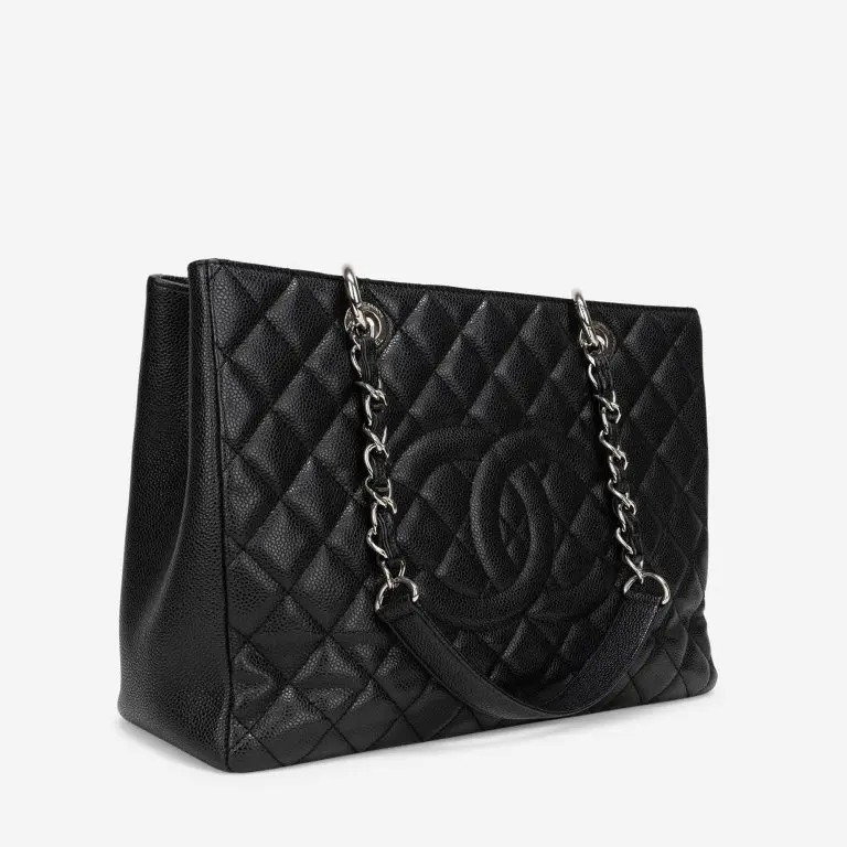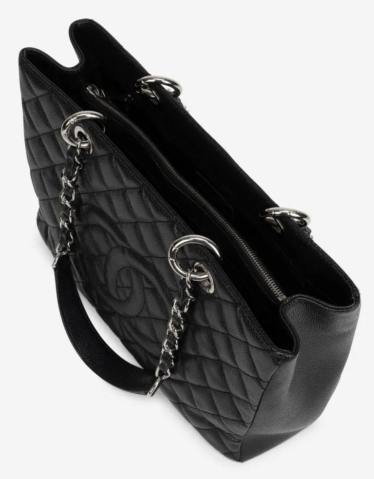 - The Grande Shopping Tote is a beloved CC classic, sophisticated and practical alike. This GST is crafted from timeless black Caviar-leather, topped with sparkling silver hardware. It offers enough room for your office essentials and adds effortless French chic to your everyday wardrobe. The carryall comes in good pre-loved condition and arrives with its box, dust bag, ID card and CC ribbon.