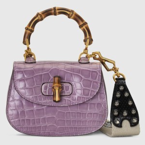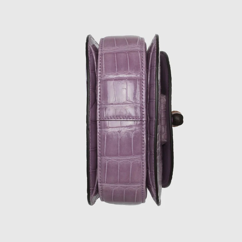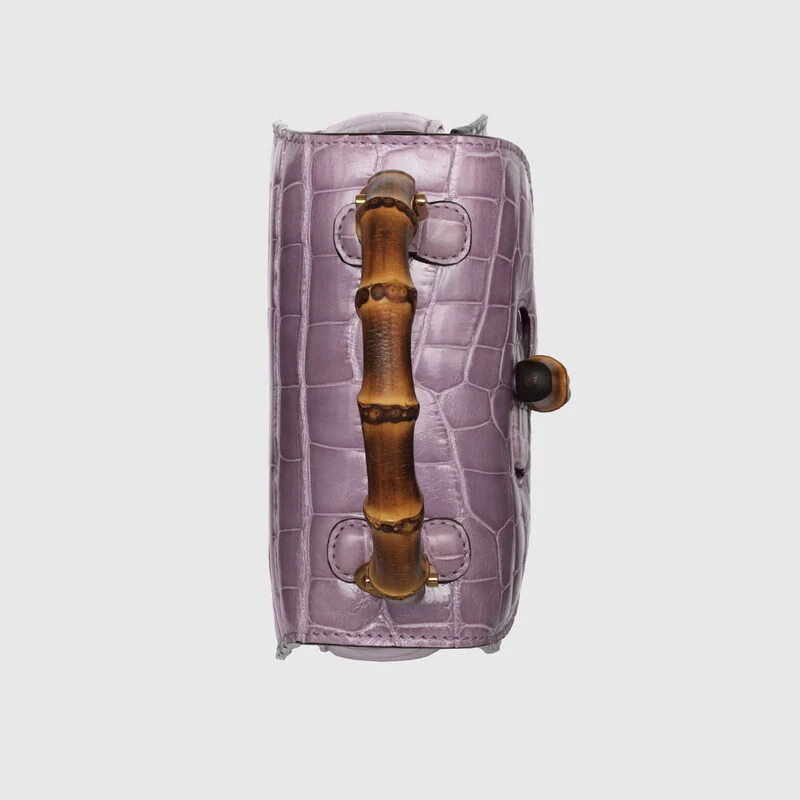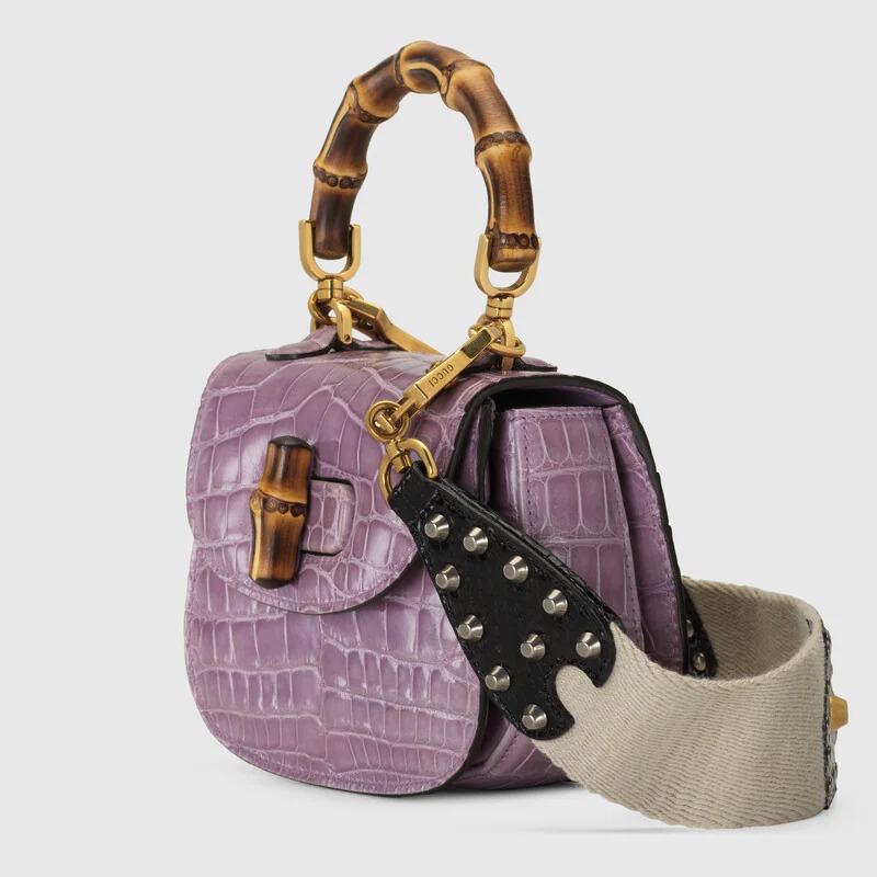 Heritage elements are reimagined with a contemporary twist throughout the Aria collection. An emblem of Gucci’s origins, bamboo has appeared throughout the House’s collections since the ’40s. After over eight decades, the material defines this crocodile mini bag. The accessory is presented in a delicate shade of lilac, enriching it with a soft dreamlike feel.