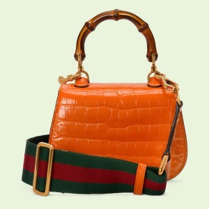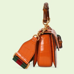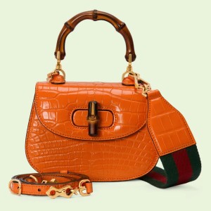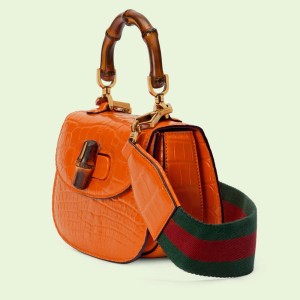 Intricate craftsmanship is a defining feature of the Gucci universe. An emblem of Gucci’s origins, bamboo has appeared throughout the House’s collections since the ’40s when in the post-war period it was difficult to find traditional materials. Decades later, the Gucci Bamboo 1947 reinterprets the hardware, pairing it with vibrant orange crocodile leather.