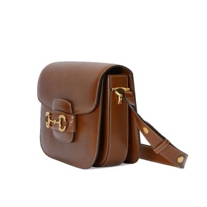 Introduced for Cruise 2020. the Horsebit 1955 bag is recreated from an archival design. With the same lines and forms first introduced over six decades ago. the accessory unifies the original details with a modern spirit. highlighting the Horsebit. Part of genetic code. the double ring and bar design has been established as one of the most distinctive elements among the House symbols borrowed from the equestrian world. Presented on a small flap shoulder bag. the hardware is paired with textured brown leather and completed with a special mechanism that adjusts the length of the shoulder strap so it can be carried on one shoulder or cross body.