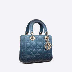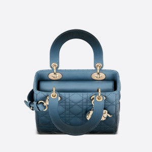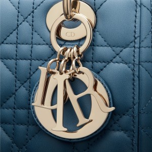 The Lady Dior My ABCDior bag epitomizes Dior’s vision of elegance and beauty. Sleek and refined, the timeless style is crafted in the season’s new indigo blue lambskin with Cannage stitching, enhanced with a gradient finish, while the pale gold-finish metal ‘D.I.O.R.’ charms further embellish its silhouette. The small, unique design may be personalized with badges placed on its shoulder strap and can be carried by hand or worn crossbody.