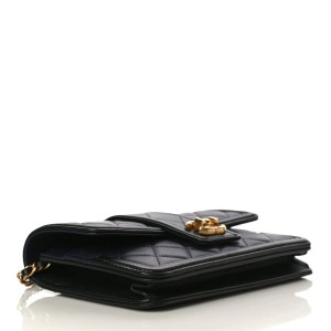 - A chic shoulder bag in navy blue diamond-quilted lambskin with black leather trim. The bag features a thinner leather threaded gold chain shoulder strap with shoulder pads and a finished gold CC press lock. The flap opens to reveal a black fabric interior with card slots and zip pocket.