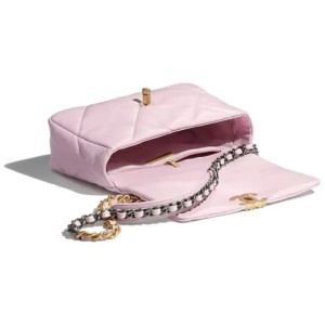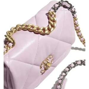 - This pillowy soft shoulder bag is crafted of oversized quilted lambskin leather in pink. The bag features an aged chain detail CC turn-lock on the flap, a magnetic snap pocket at the rear, and a leather threaded aged gold, ruthenium, and dark silver chain-link shoulder strap with a leather shoulder pad. The front flap opens to a fabric interior with a zipper pocket.