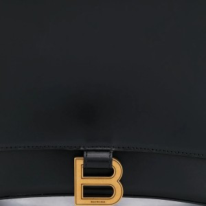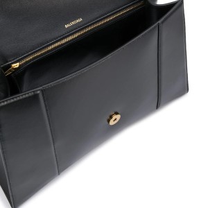 - Case in point: this black leather medium Hourglass tote bag. Featuring a detachable and adjustable shoulder strap. a top handle. a foldover top with magnetic closure. a main internal compartment. an internal zipped pocket. an embossed internal logo stamp. a back slip pocket and a curvilinear base.