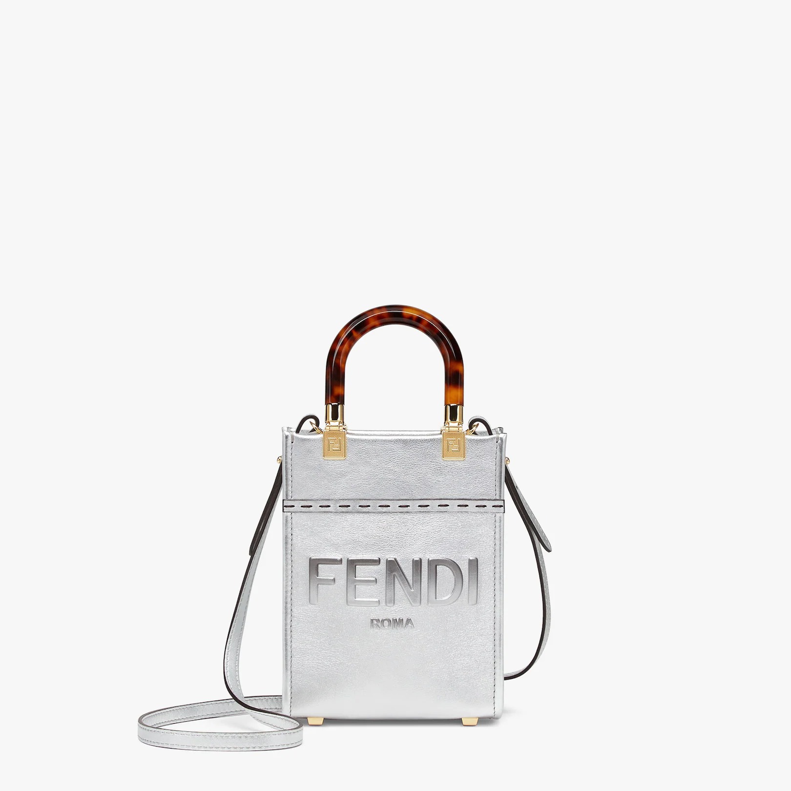 Mini Sunshine Shopper bag in silver laminated leather with hot-stamped graduated ROMA print and tortoiseshell-effect plexiglass rigid handles.With an interior microfibre-lined compartment. gold-finish metalware.Can be carried by hand or worn on the shoulder thanks to the two handles and thin adjustable and detachable shoulder strap.Made in Italy