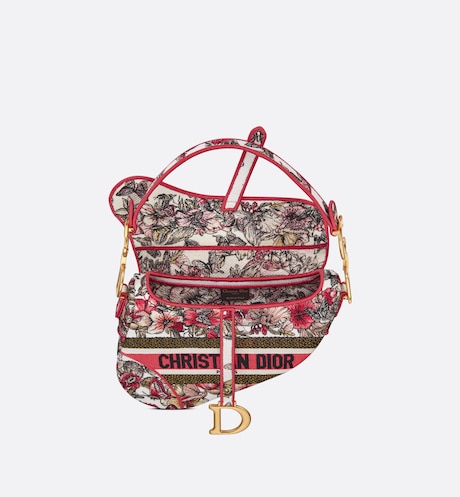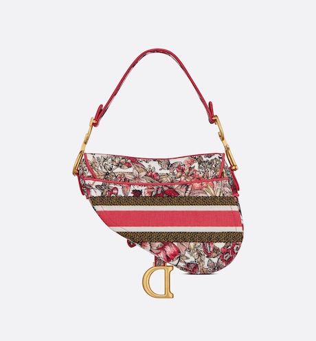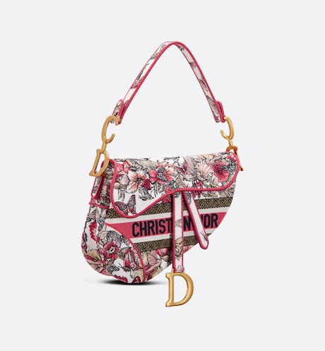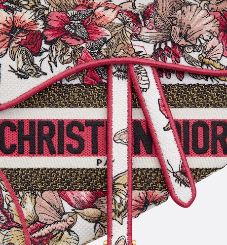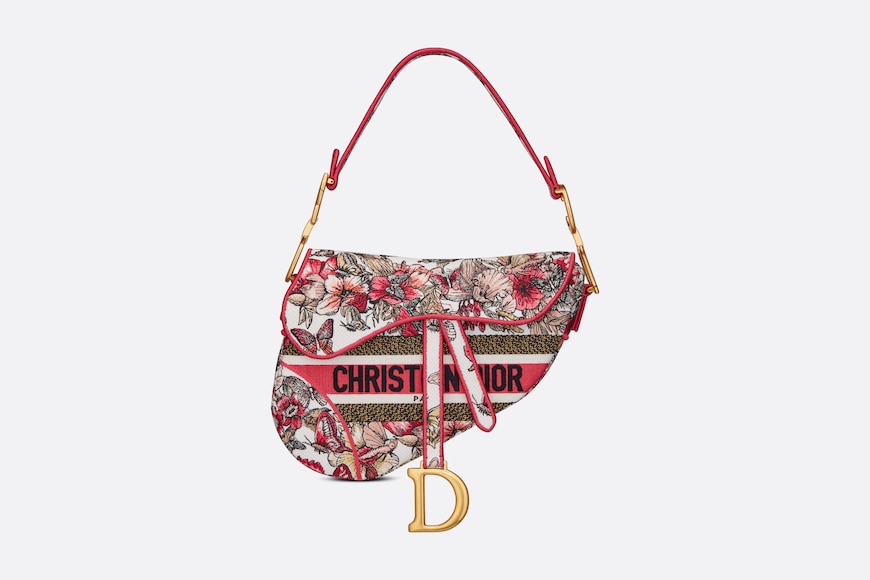 Maria Grazia Chiuri brings a fresh update to the iconic Saddle bag. The design is fully embroidered with a poetic multicolor butterfly motif and has signature on the front. The legendary style has a Saddle flap with a magnetic ‘D’ stirrup clasp. as well as an antique gold-finish metal ‘CD’ signature on each side of the handle. The bag can be carried by hand or worn over the shoulder and may be customized with different shoulder straps.