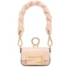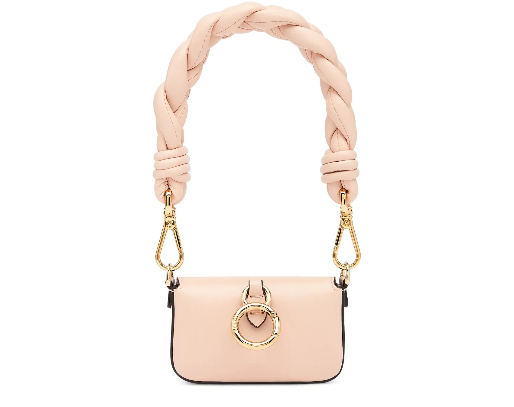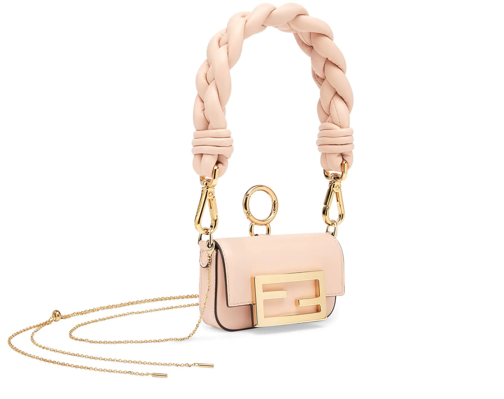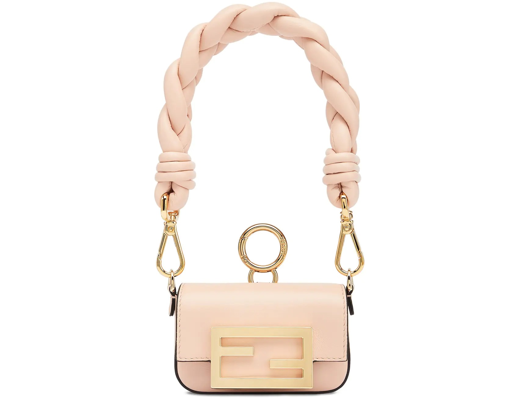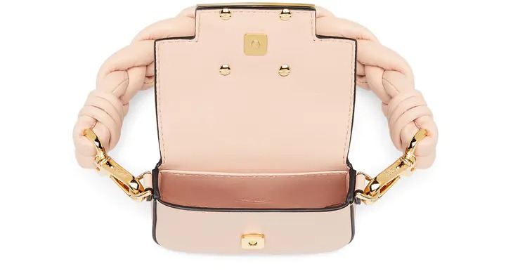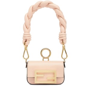 Nano version of the iconic Baguette bag, with flap and oversized FF fastening with magnetic clasp. The clip allows it to be attached to larger bags or belts. It can also be worn cross-body thanks to the fine chain adjustable shoulder strap. Credit card holder flat pocket inside. Made of pale pink leather. Oversized woven nappa leather handle. Gold-finish metalware.