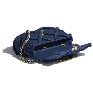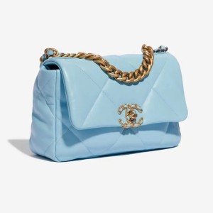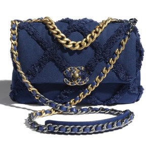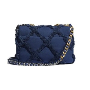 - This pillowy soft shoulder bag is crafted of oversized quilted tweed in blue. The refined bag features a chain detail CC turn-lock on the flap, a magnetic snap pocket at the rear, and a leather threaded aged gold, ruthenium, and dark silver chain-link shoulder strap with a leather shoulder pad. The front flap opens to a blue fabric interior with a zipper pocket.