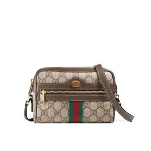 he world of Ophidia evolves with the introduction of a mini bag shape. crafted from GG Supreme canvas with Web stripe detail. First used in the 1970s. the GG logo was an evolution of the original Gucci rhombi design from the 1930s. and from then it’s been an established symbol of GG heritage. Beige/ebony GG Supreme canvas. a material with low environmental impact. with brown leather trim. Green and red Web. Gold-toned hardware. Oval enamel detail with metal Double G. Attached key ring that can attach to a separate bag. Front zipper pocket. Interior open pocket. Adjustable shoulder strap with a 25.5″ drop. Zipper closure. 7″W x 4.5″H x 2″D. Microfiber lining with a suede-like finish. Made in Italy.