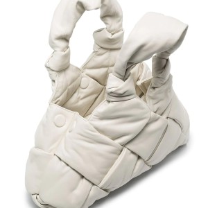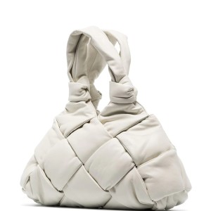 The Padded Lock tote bag is crafted in soft leather with BV signature Intrecciato design with a padded construction. With a trapeze shape and slightly slouchy design. it can be carried with its two knotted top handles. The unlined interior is adorned with a subtle embossed logo on the bottom.