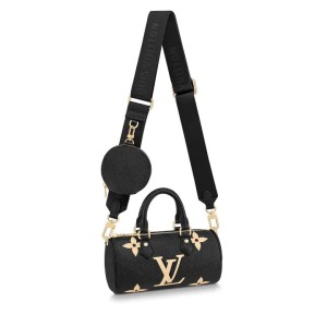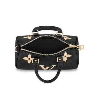 The House’s historic Papillon bag is now offered in an adorable BB size. Crafted from Monogram Empreinte leather, this bicolor model features an oversized embossed motif and is accessorized with a cute matching coin purse. Fitted with a wide, removable jacquard strap and two classic Toron top handles, the bag can be carried in several stylish ways.