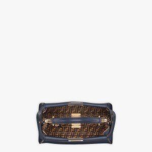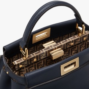 Iconic small Peekaboo bag made of dark blue leather and embellished with the classic twist lock on both sides.Featuring a suede lining with brown FF motif. two internal compartments separated by a stiff partition. an inner zipper pocket and gold-finish metalware.The bag can be carried by hand or worn either on the shoulder or cross-body thanks to the handle and adjustable. detachable shoulder strap.Made in Italy