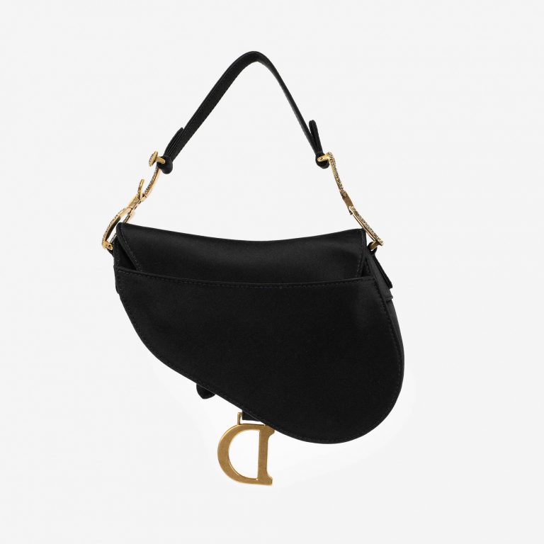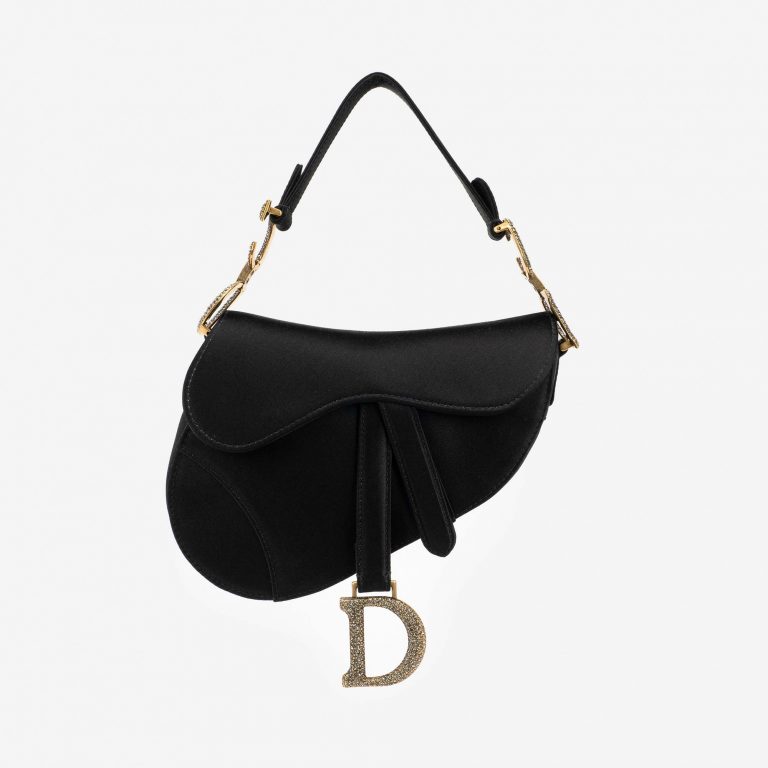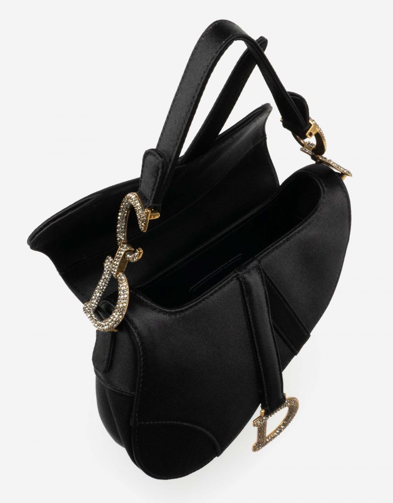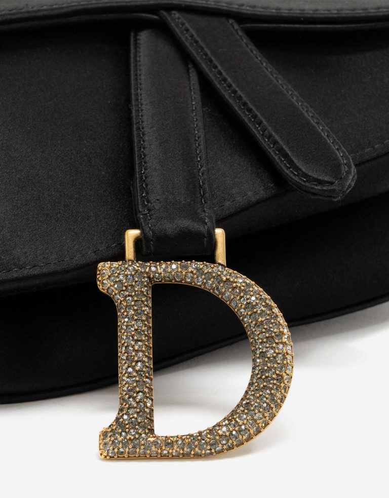 - Made from lustrous black satin. this mini CD Saddle Bag is best suited for evening affairs. It features the oversized gold-coloured ‘CD’ elements and magnetic clasp. adorned with sparkling smoky crystals. Carry it over your shoulder or in your hand and pair it with festive attire for your next night out. The bag comes in unworn condition.