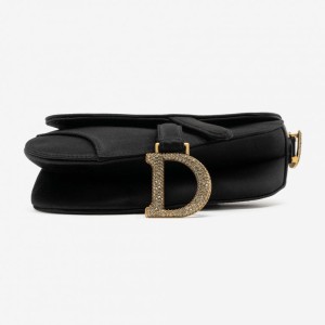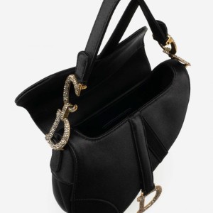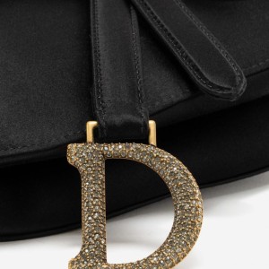 - Made from lustrous black satin. this mini CD Saddle Bag is best suited for evening affairs. It features the oversized gold-coloured ‘CD’ elements and magnetic clasp. adorned with sparkling smoky crystals. Carry it over your shoulder or in your hand and pair it with festive attire for your next night out. The bag comes in unworn condition.