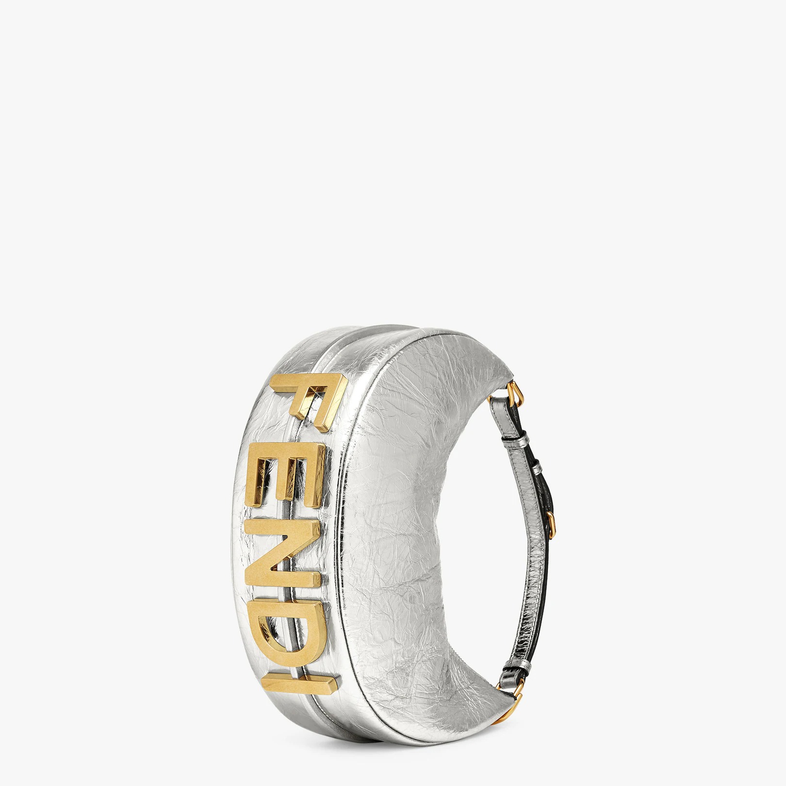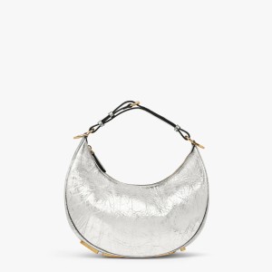 Small Hobo bag made of silver soft laminated leather with a craquel?? effect. With vintage gold metal lettering visible when the bag is worn under the arm.Zip closure with fabric-lined internal compartment. gold-finish metalware.Can be worn under the arm or cross-body thanks to the adjustable. detachable handle and the hooks that allow a shoulder strap to be attached.Made in Italy