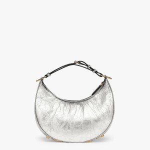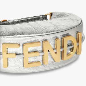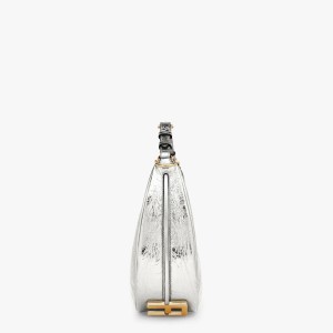 Small Hobo bag made of silver soft laminated leather with a craquel?? effect. With vintage gold metal lettering visible when the bag is worn under the arm.Zip closure with fabric-lined internal compartment. gold-finish metalware.Can be worn under the arm or cross-body thanks to the adjustable. detachable handle and the hooks that allow a shoulder strap to be attached.Made in Italy