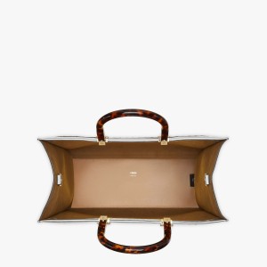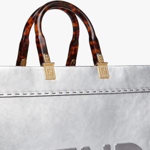 Medium Sunshine Shopper bag in silver laminated leather with hot-stamped graduated ROMA motif and tortoiseshell-effect plexiglass rigid handles.Featuring a roomy internal lined compartment. gold-finish metalware.Can be carried by hand or worn on the shoulder thanks to the two handles and detachable shoulder strap.Made in Italy