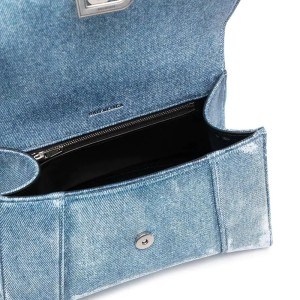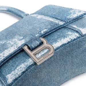 - B’s signature Hourglass tote bag is presented in a denim blue print with a distressed-effect finish. Fabricated from Italy, the sculpted silhouette is crafted in leather and boasts branded silver-tone hardware.
