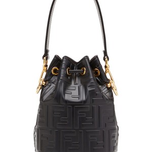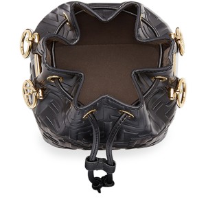 Small Mon Tresor bucket bag with drawstring fastening and metal decorations in the logo shape. Two detachable shoulder straps. one long and one short. to wear the bag over the shoulder or cross-body. Made calfskin. Iconic FF pattern created in a raised print. Palladium-finish metalware.