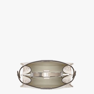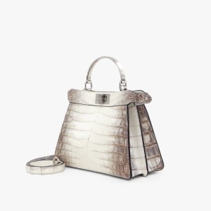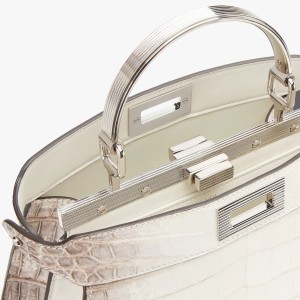 Small iconic Peekaboo ISeeU bag. made of exquisite crocodile leather in graduated shades of white. embellished with the classic twist lock on both sides.Featuring a soft tone on tone nappa leather lining visible from the outside. two compartments separated by a stiff partition. an inner pocket. metalware and handle with exquisite guilloche palladium finish.Can be carried by hand or on the shoulder thanks to the handle and the adjustable. detachable shoulder strap.Made in Italy
